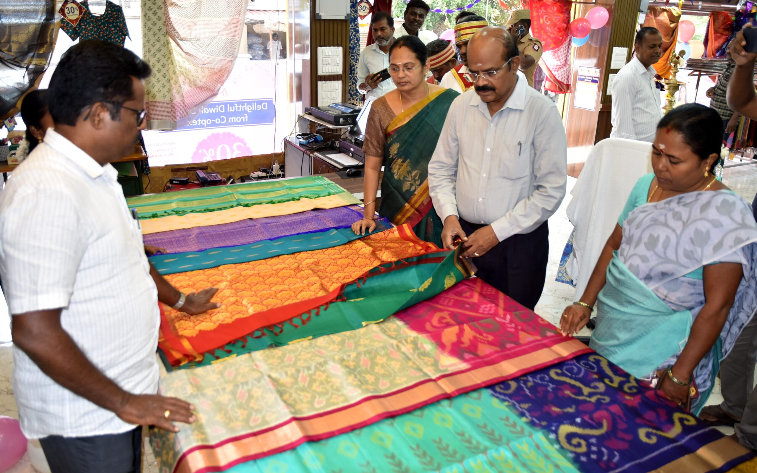 கரூர் கோ-ஆப் டெக்ஸ் விற்பனை நிலையத்தில் தீபாவளி சிறப்பு தள்ளுபடி விற்பனையினை கலெக்டர் தங்கவேல் குத்துவிளக்கேற்றி வைத்து முதல் விற்பனையை தொடங்கி வைத்தார்.